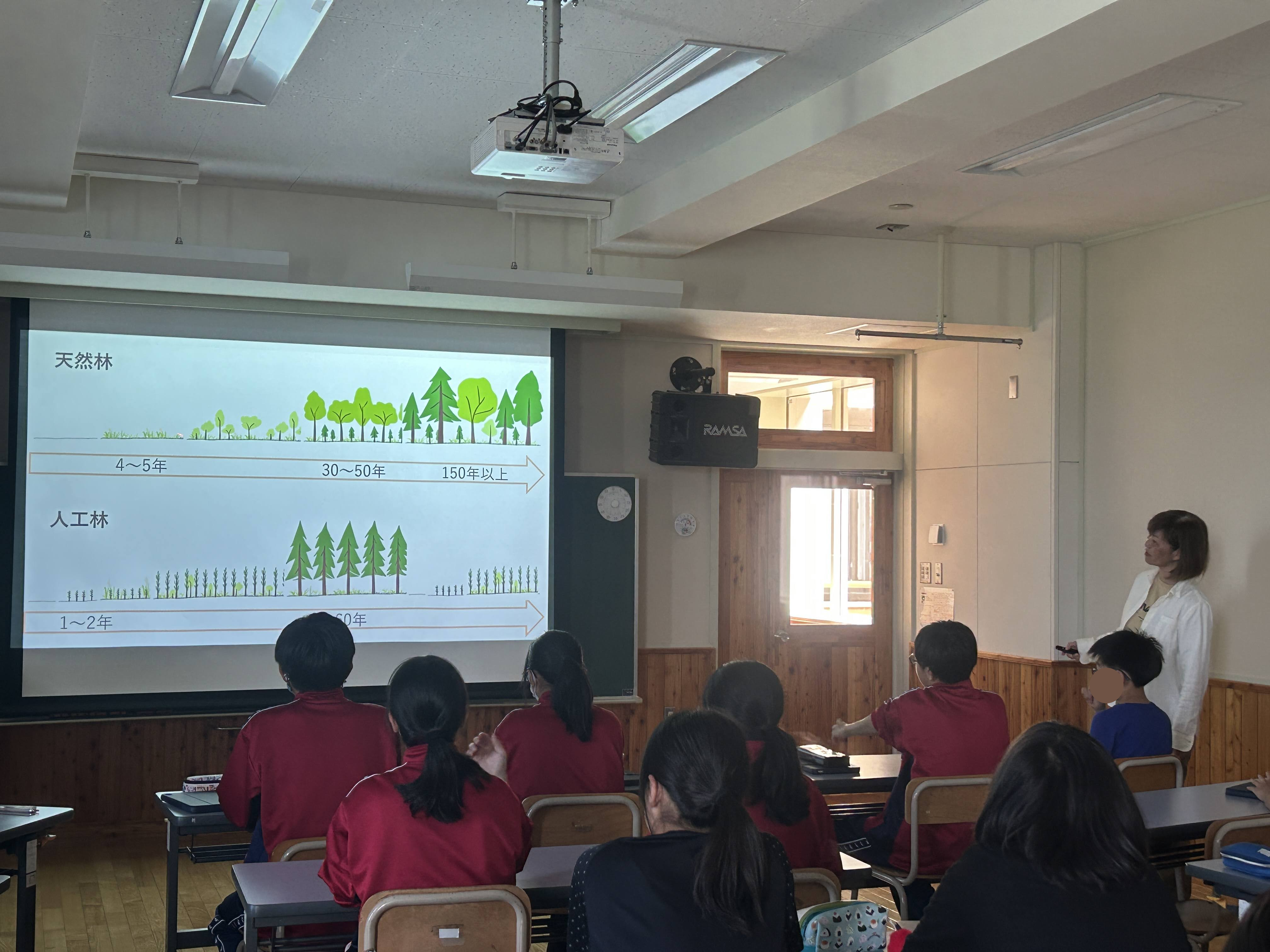 最初の授業では、下川町が循環型森林経営をはじめることになった歴史を紹介したのち、