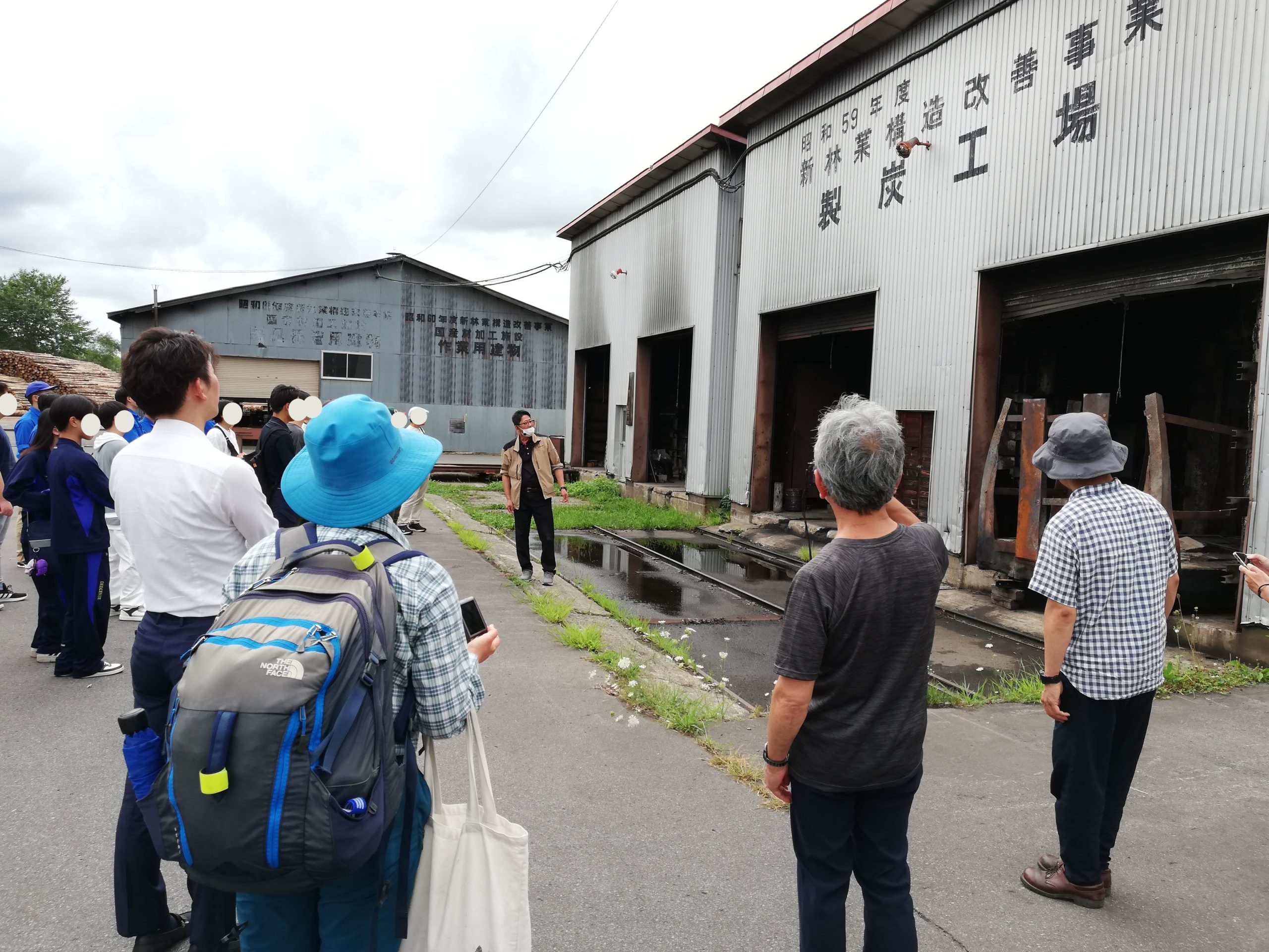 森林組合北町工場では、建材などにならない木の円柱材や炭への加工、また炭に加工する際に採取できる木酢液を用いた防腐加工の現場を見学。