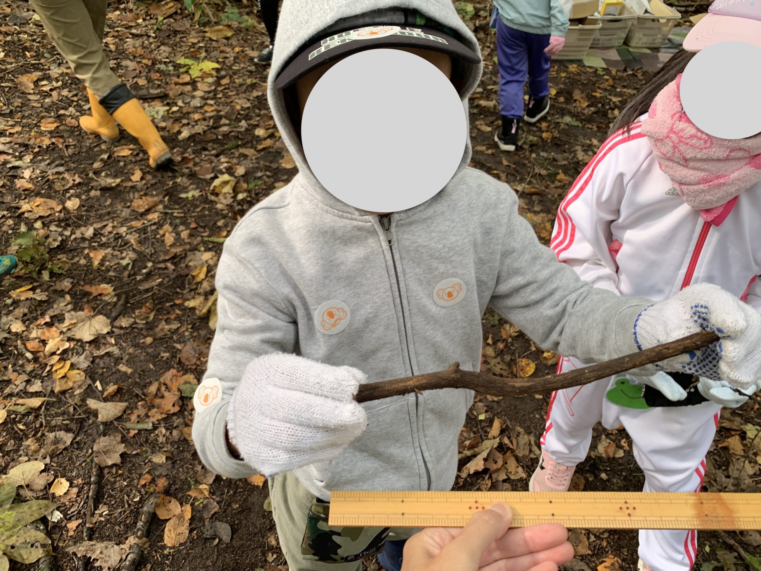 算数の「長さ」の単元に絡めて、森の中からお題にあった長さのものを見つけてきて、長さが合っているかどうか実際にものさしで測ってみます。