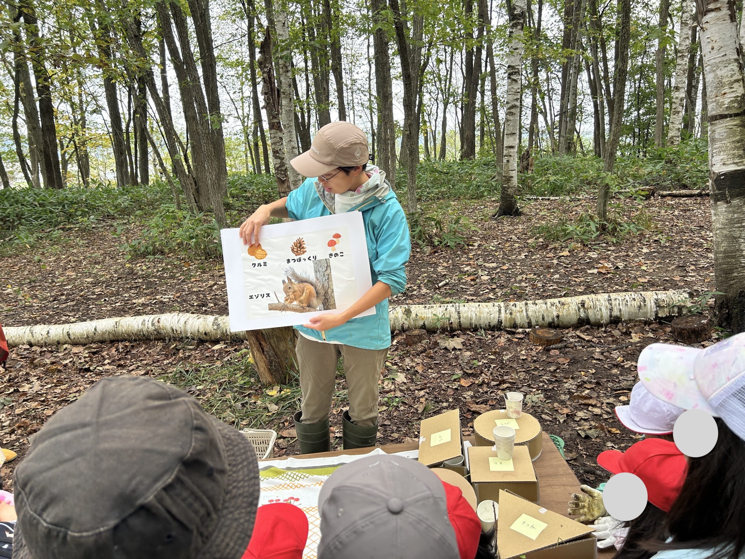 「リスさーん!!」と呼びかけると、スタッフが扮したリスが登場しました。
