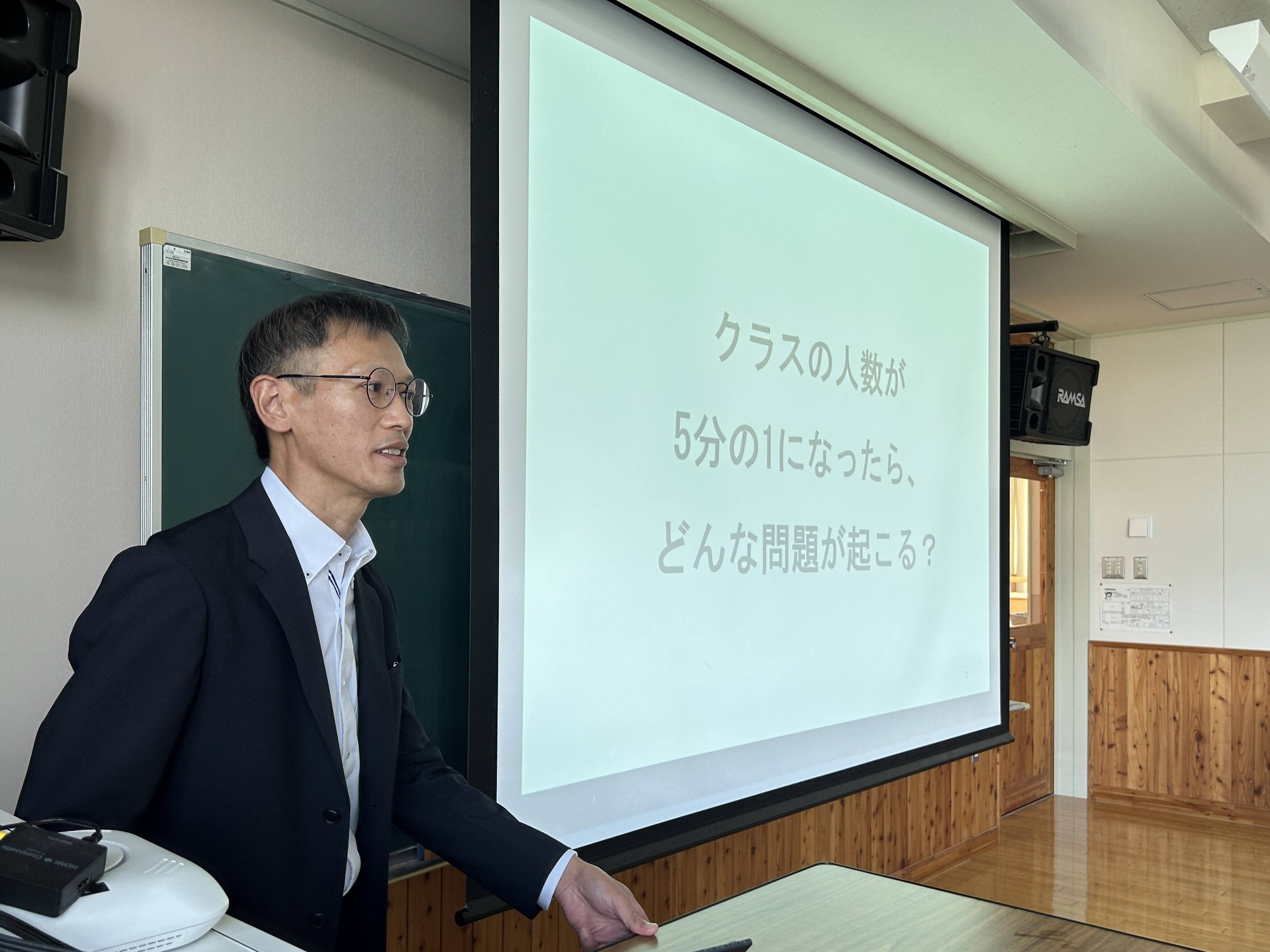人口減少の話では、生徒さんがわかりやすいようにクラスに例えての問いかけ。