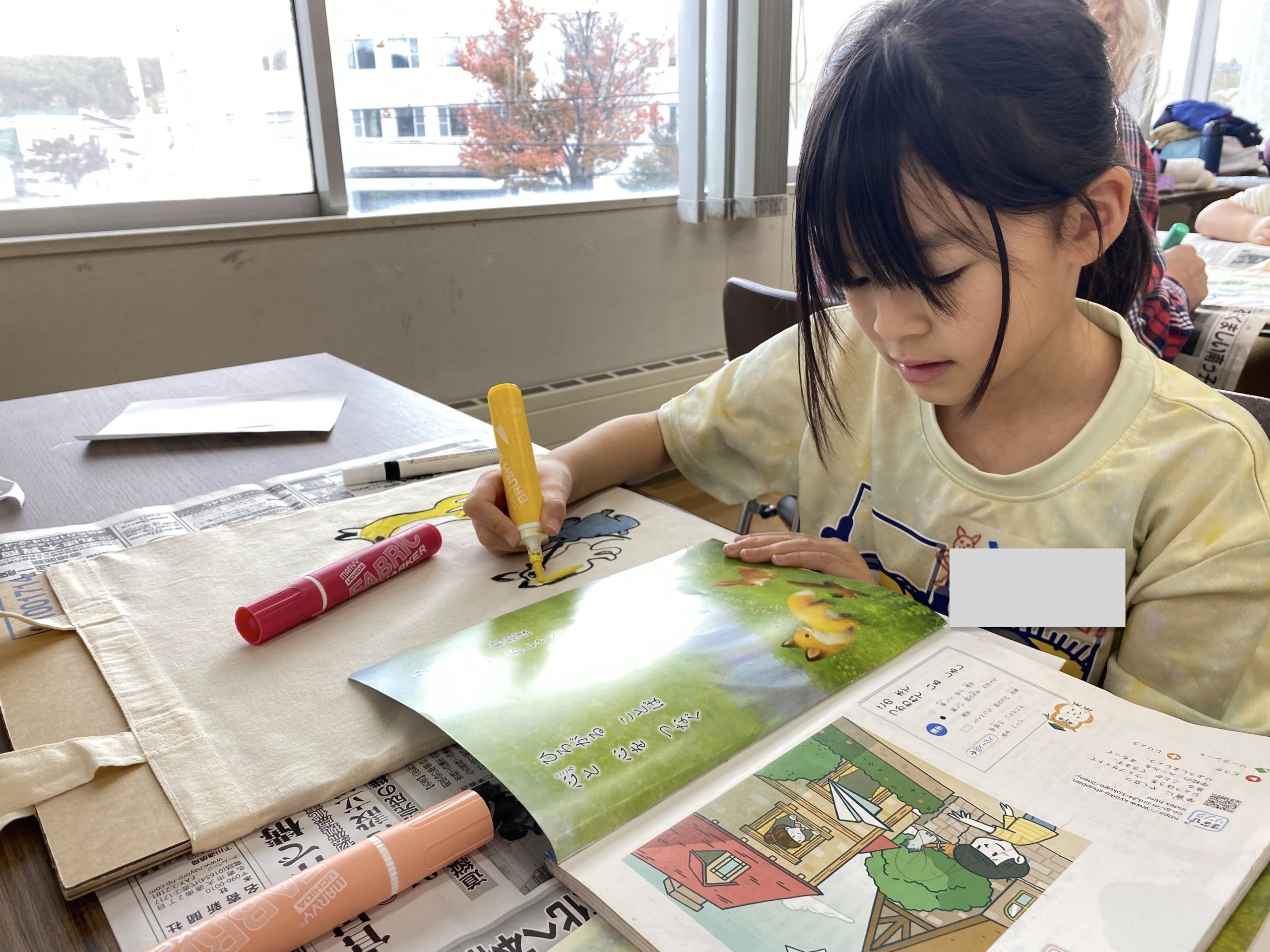 コットンの無地のバッグに、布に描けるペンで絵を描いていきます。
