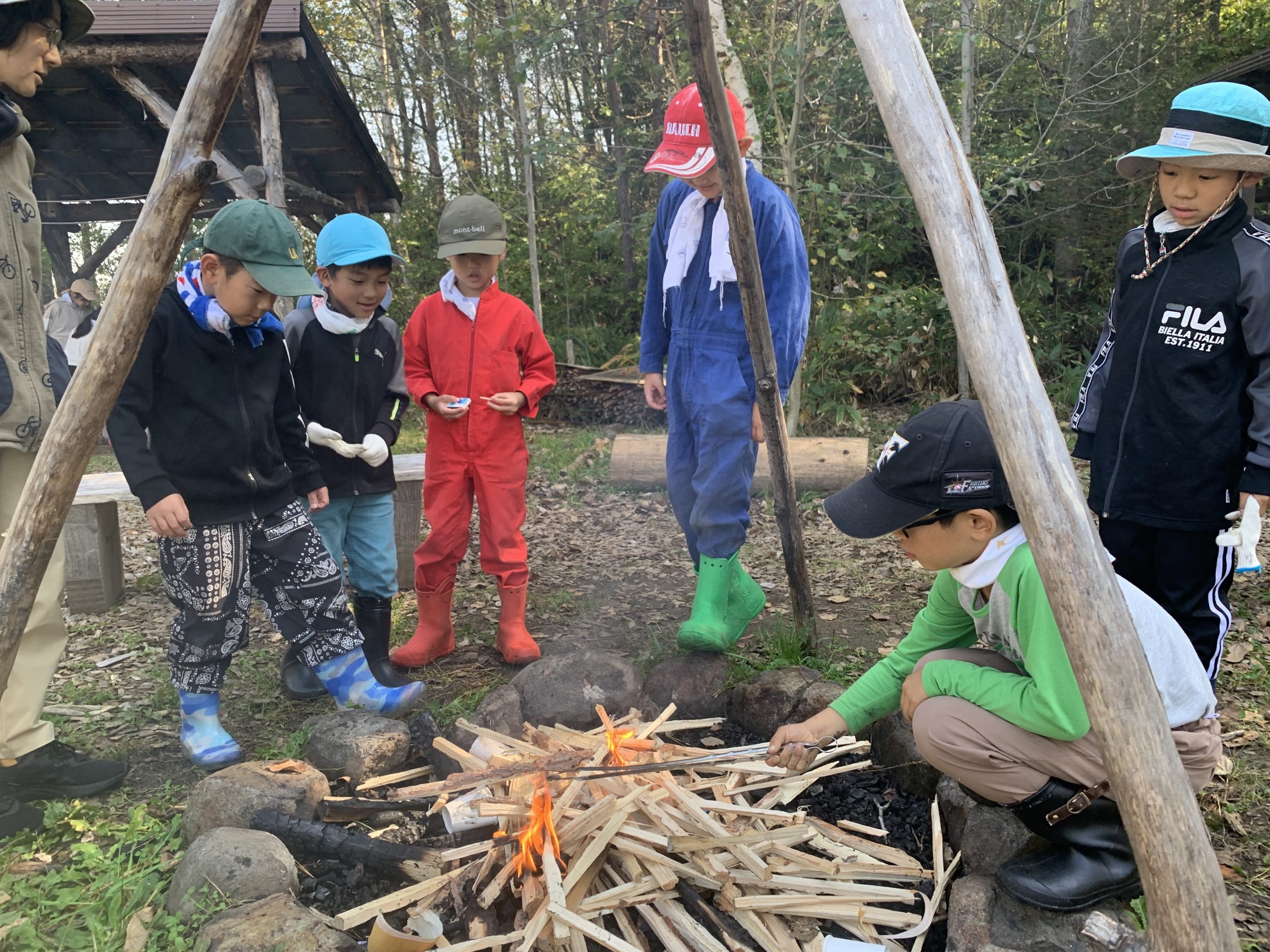 火おこし班は二か所に火おこしするので、子どもたち同士で話をして男子と女子にわかれて作業開始です。