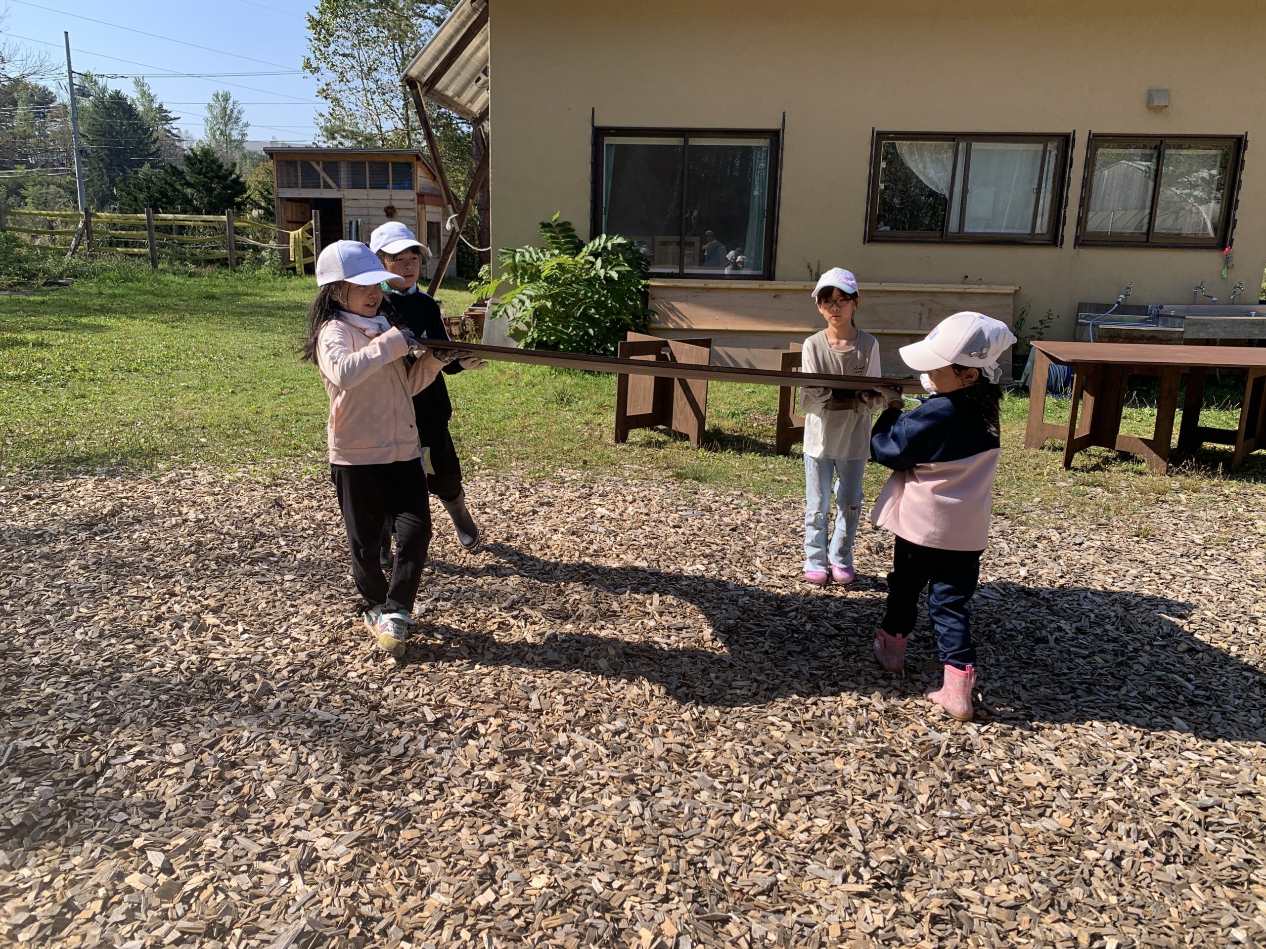 重たい板やブロックもみんなで協力して運んだら、あっという間に終わります。