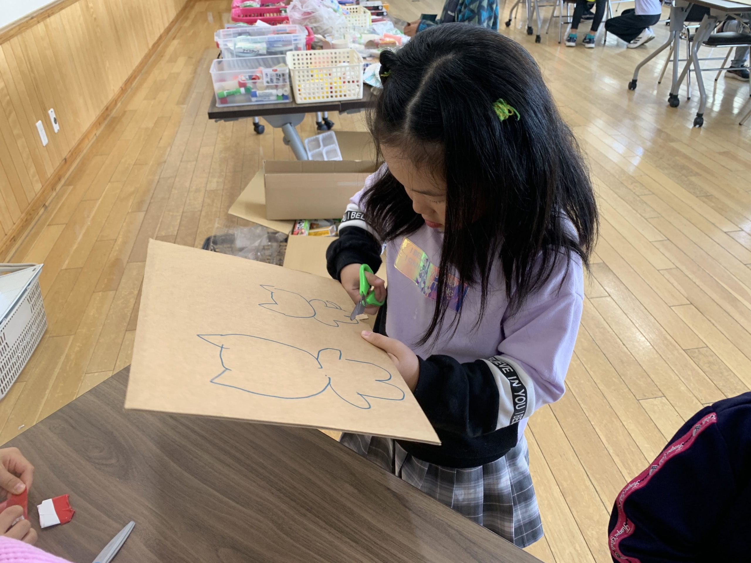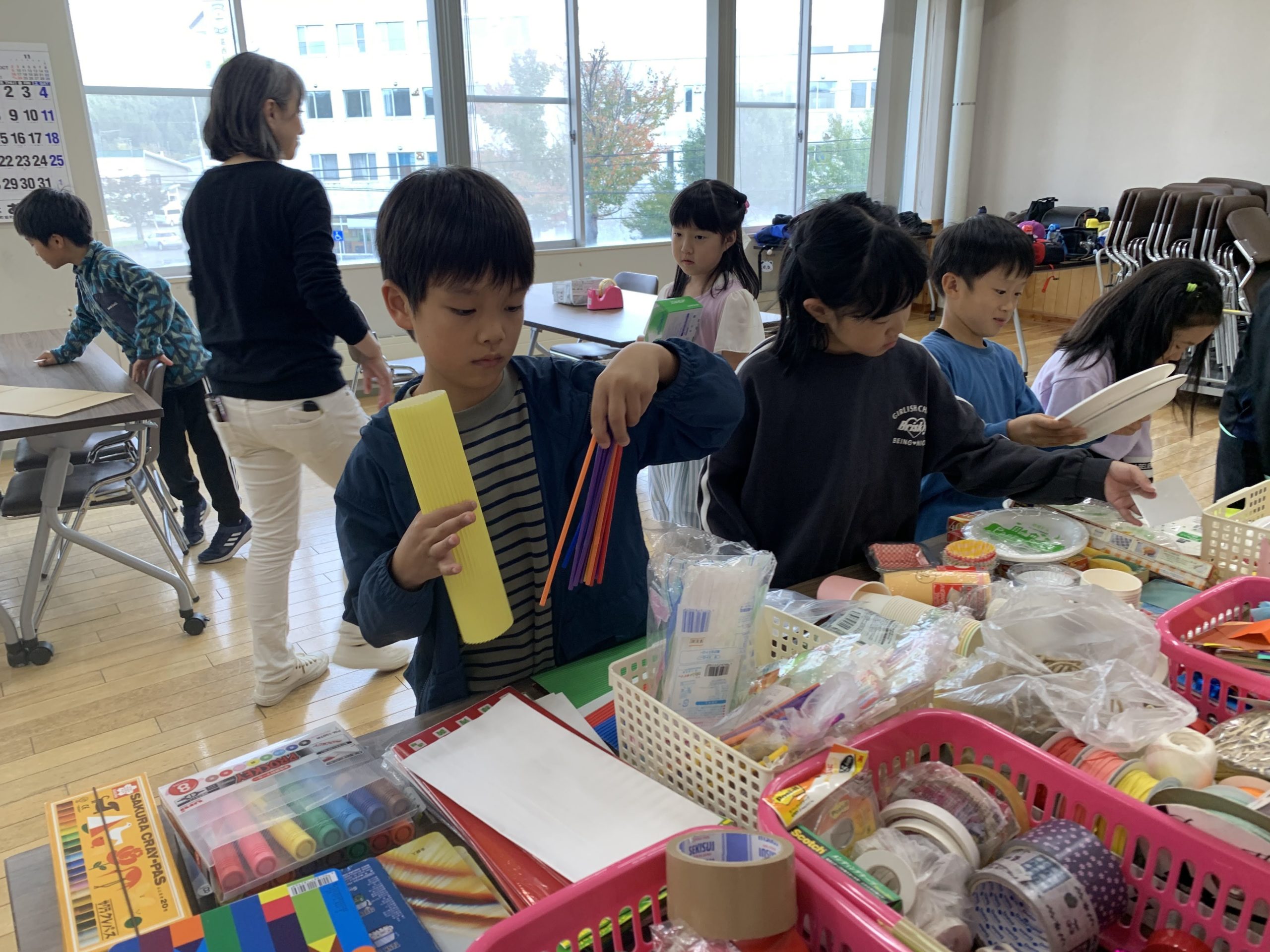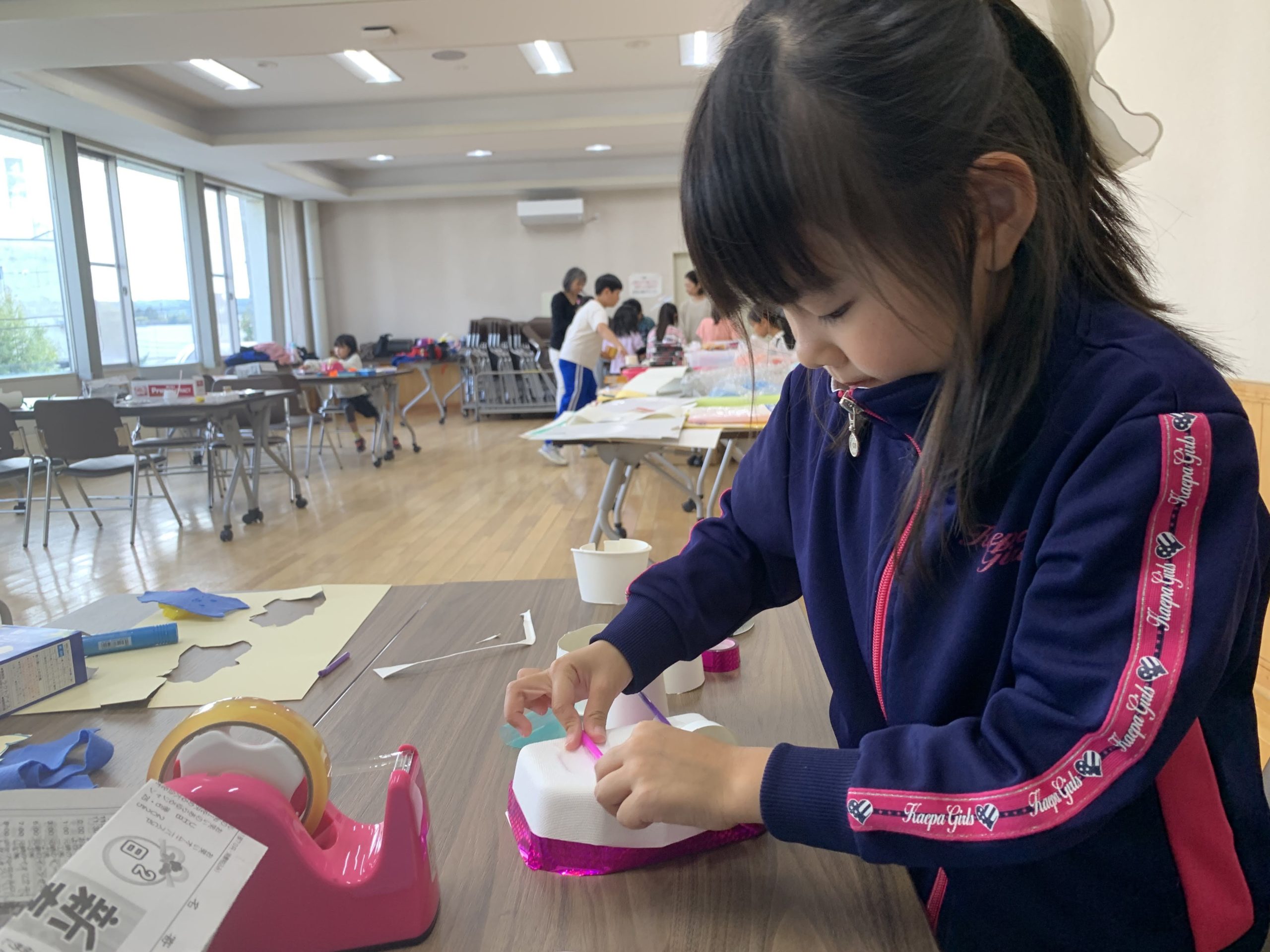 たくさんの材料が並ぶ中から、空き箱やモール、段ボールやキラキラのテープなど好きなものを選んで、自由に工作タイムです。