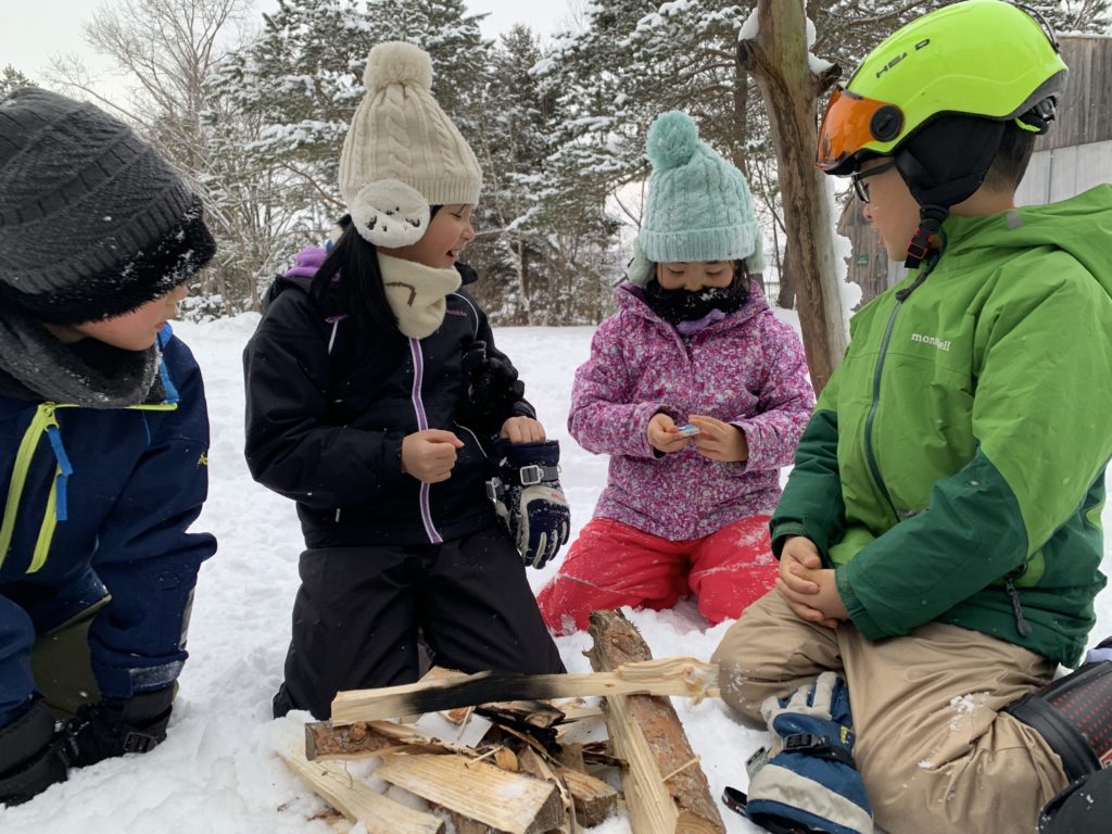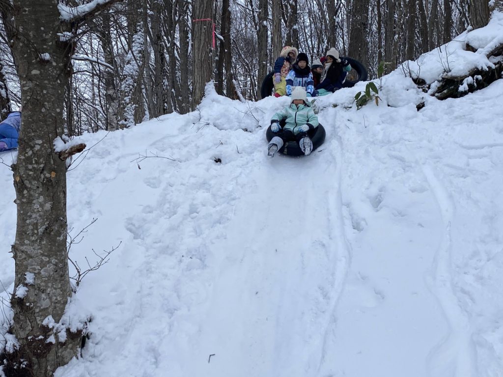 雪合戦、新しく開拓したしりすべりの場所でチューブ滑りやしり滑り、火おこし、みくわが丘に滞在中のハナちゃんとのふれあいなど思い思いの遊びをしています。