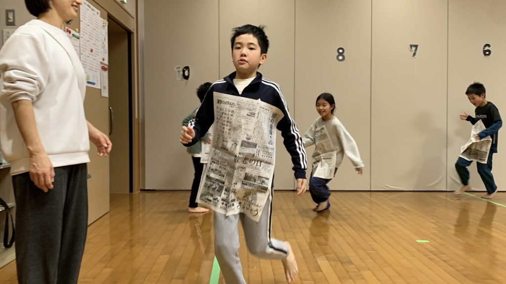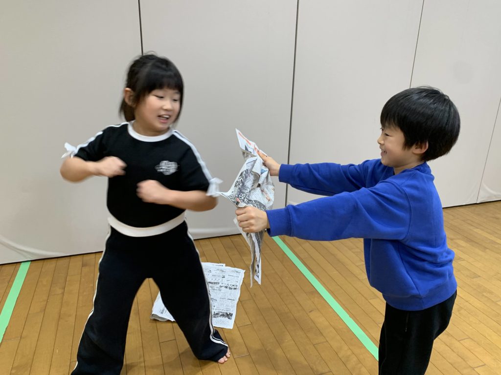 新聞紙を体の前にして落とさないように走ったり、パンチで新聞紙を破ってみたり、、見ていると簡単そうですが、実際にやってみると結構大変!!