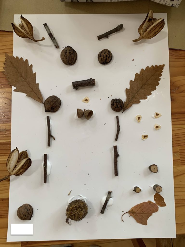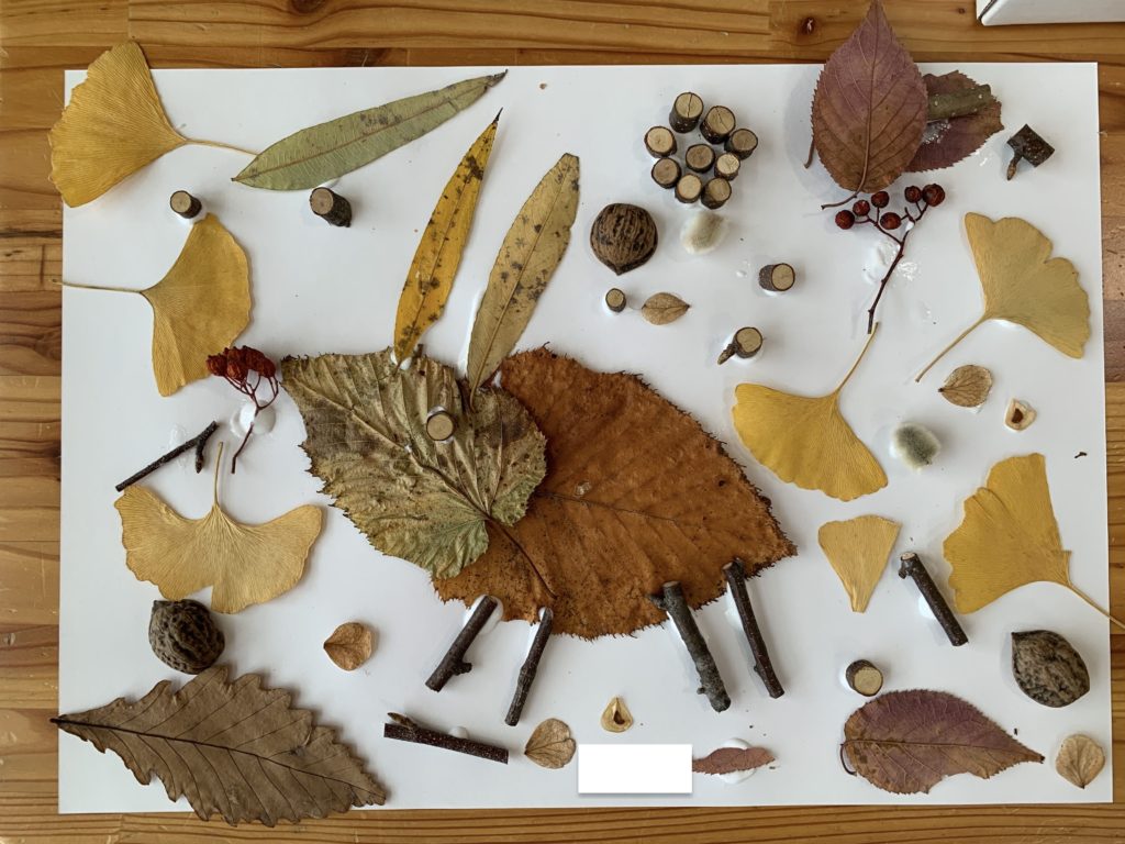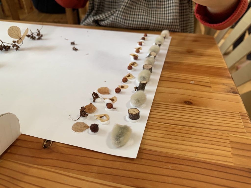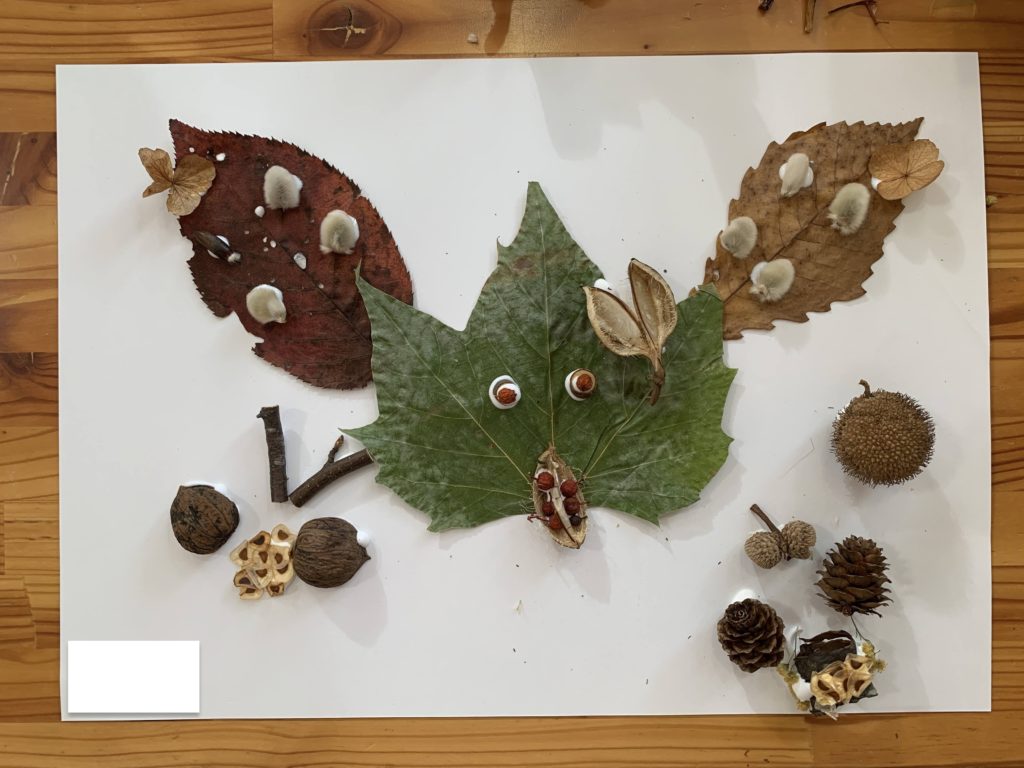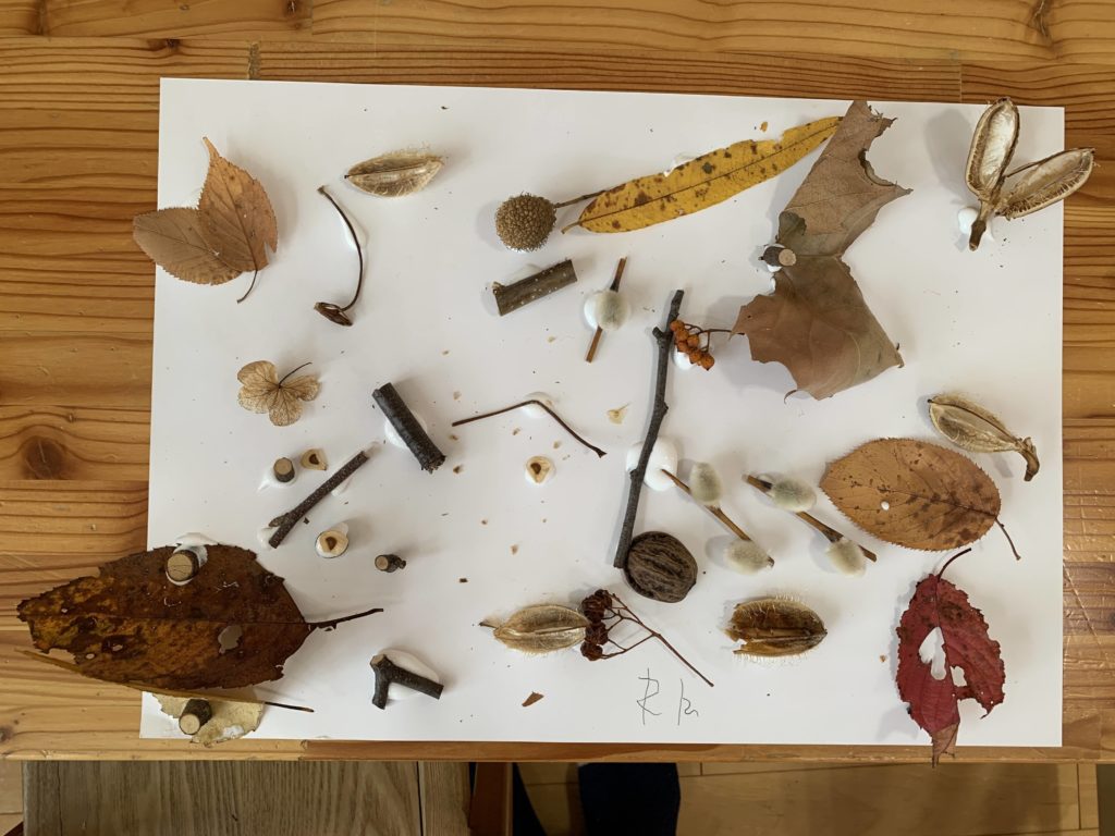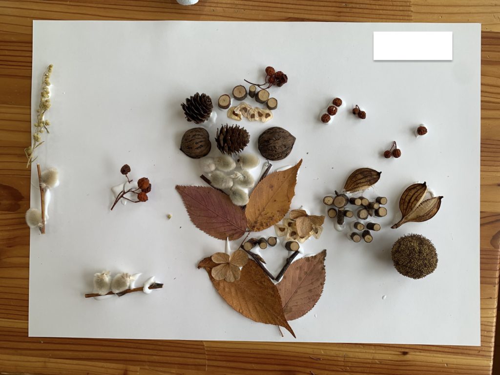 みんなの目の前にはスタッフが集めた木の実やドライフラワーと10月の森のあそびで自分たちが集めた葉っぱや木の実があります。