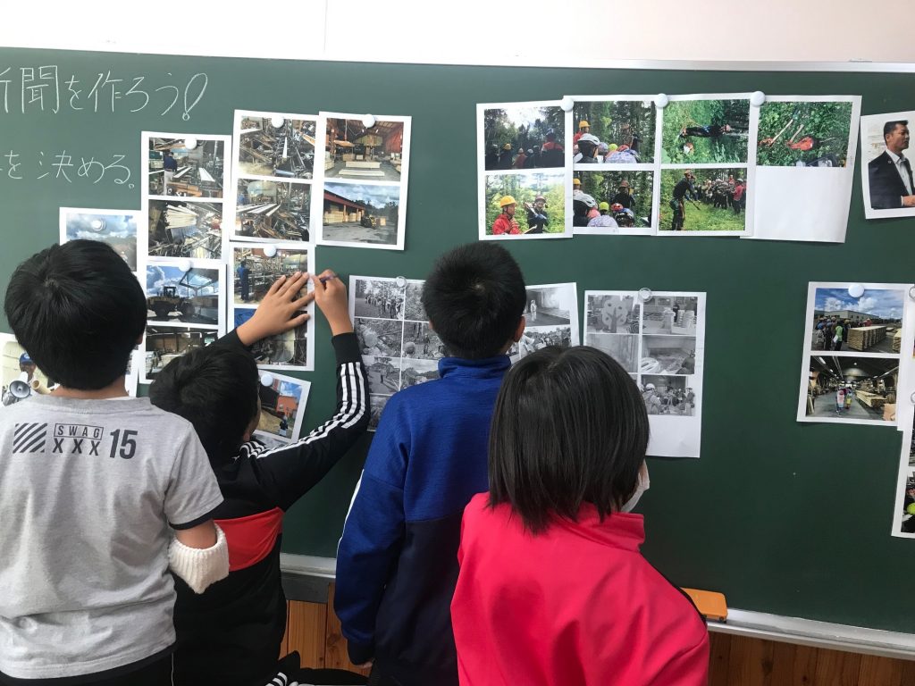 そこで、身の回りの森から生まれたものに気づき、下川の森から、小学校で使っている机やロッカー、床板などの身の回りのものとのつながりを、自分たちで現場に出向いて取材して、新聞にまとめるプログラムを実施することにしました。