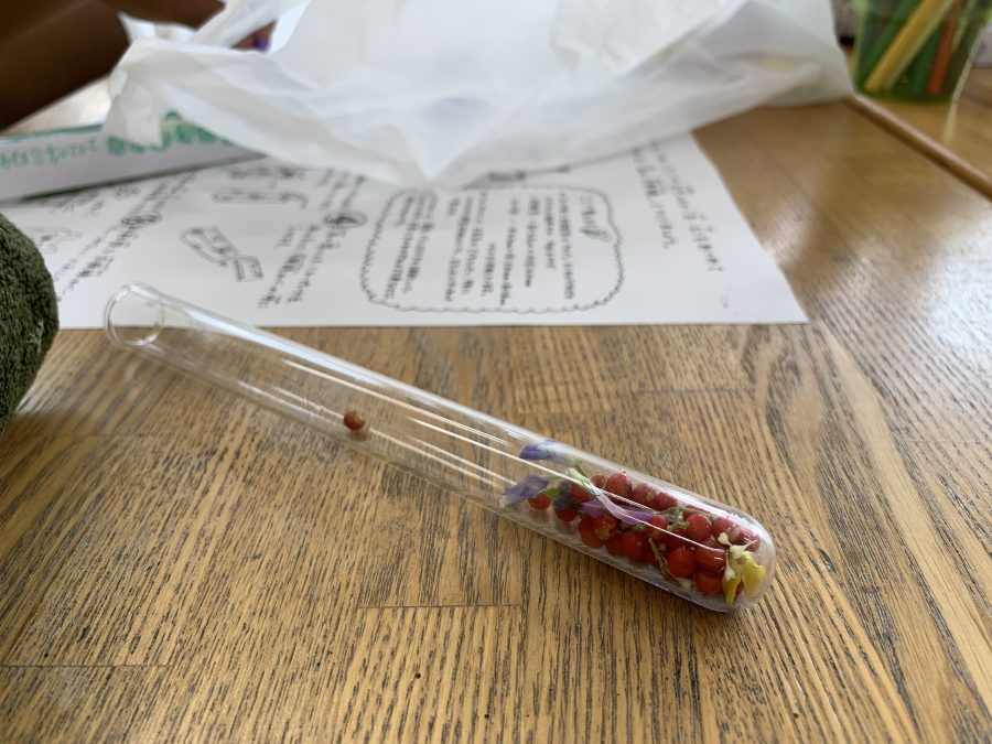 絵を描き終えると試験管の中に採取してきた素材を入れ、グリセリンを注ぎ、コルクで蓋をします。