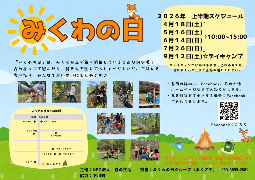 みくわの日 [開催日] 2026年6月14日 イベント 『みくわの日』は、みくわが丘で毎月開催している自由な遊び場です! 森や原っぱで遊んだり、たき火を囲んでおしゃべりしたり、お茶をしたり、みんなで思い思いに楽しめます♪ 焚き火を起こすので、食器、食べ物、飲み物、焚き火で焼きたいものなどお持ちのうえ、ぜひお越しください。 申し込みは不要です。 ぜひ遊びに来てください! みくわの日 みくわの日